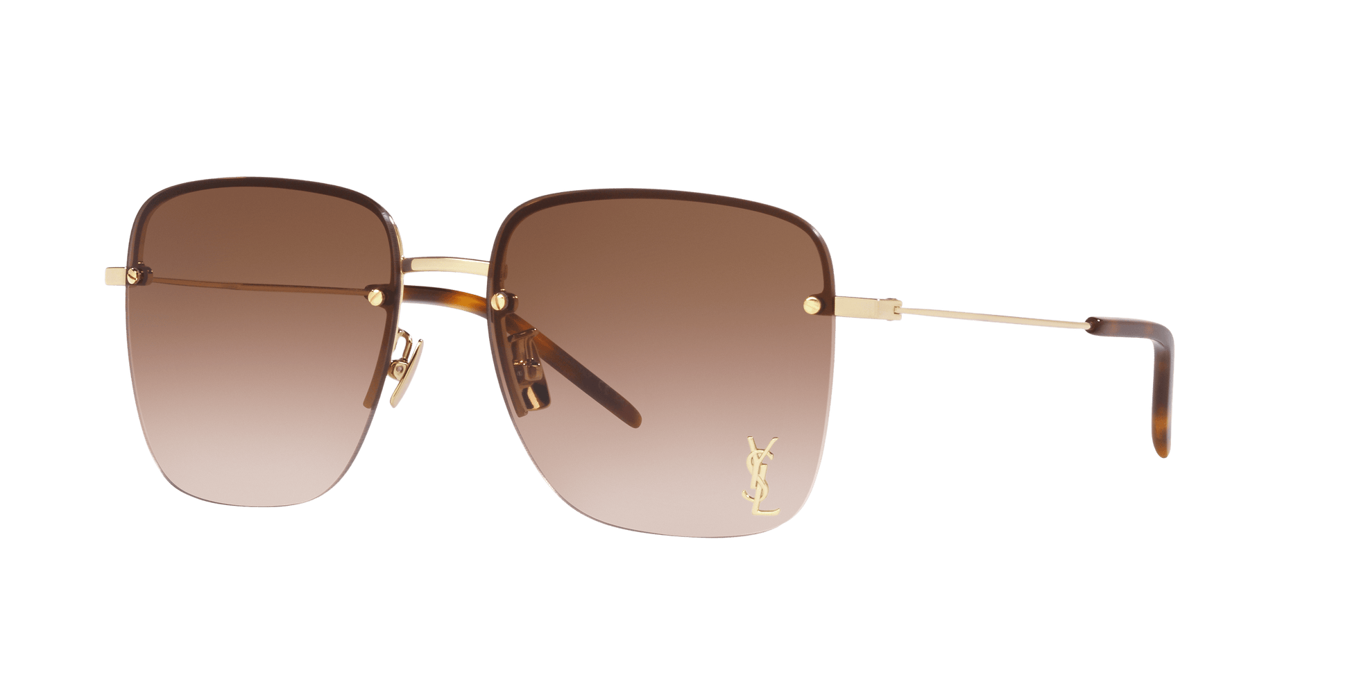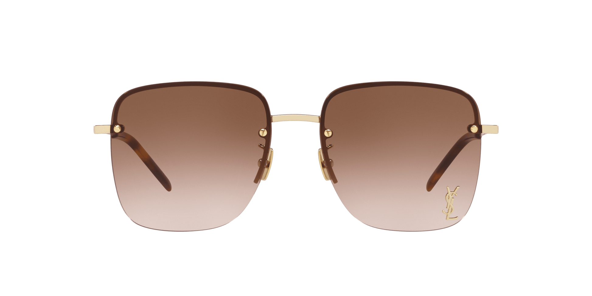 Modern feminine shape for a square half rim. Ultra-light metal style contrasts with the bold YSL logo located on the lens. Shiny metal structure featuring refined gradient lenses. The style is enriched with gradient and colored lenses in natural shades